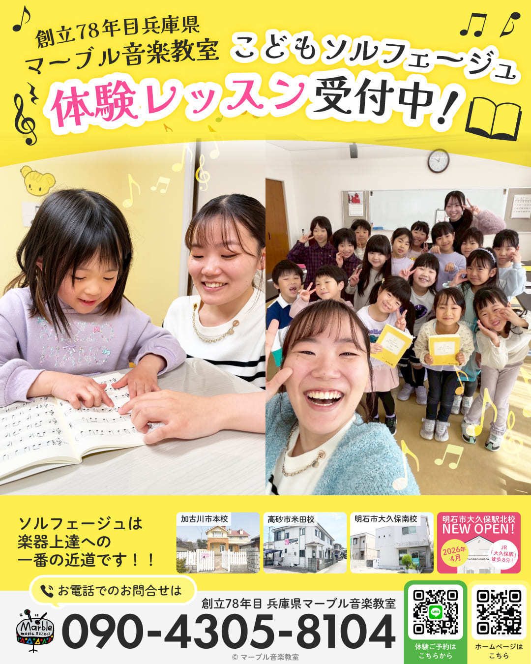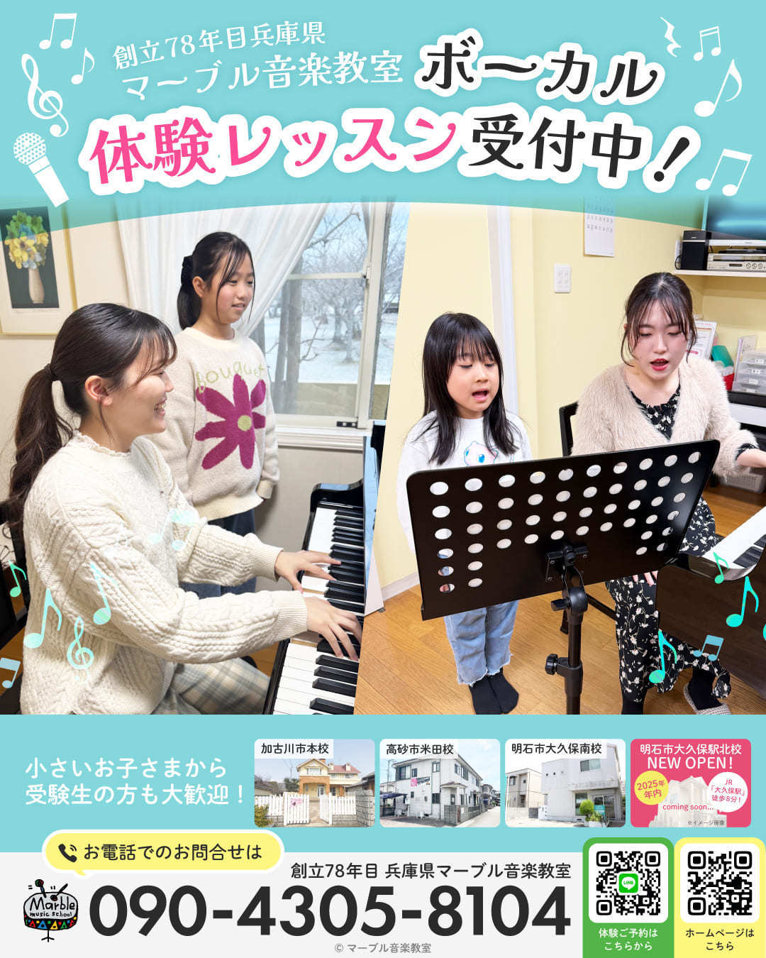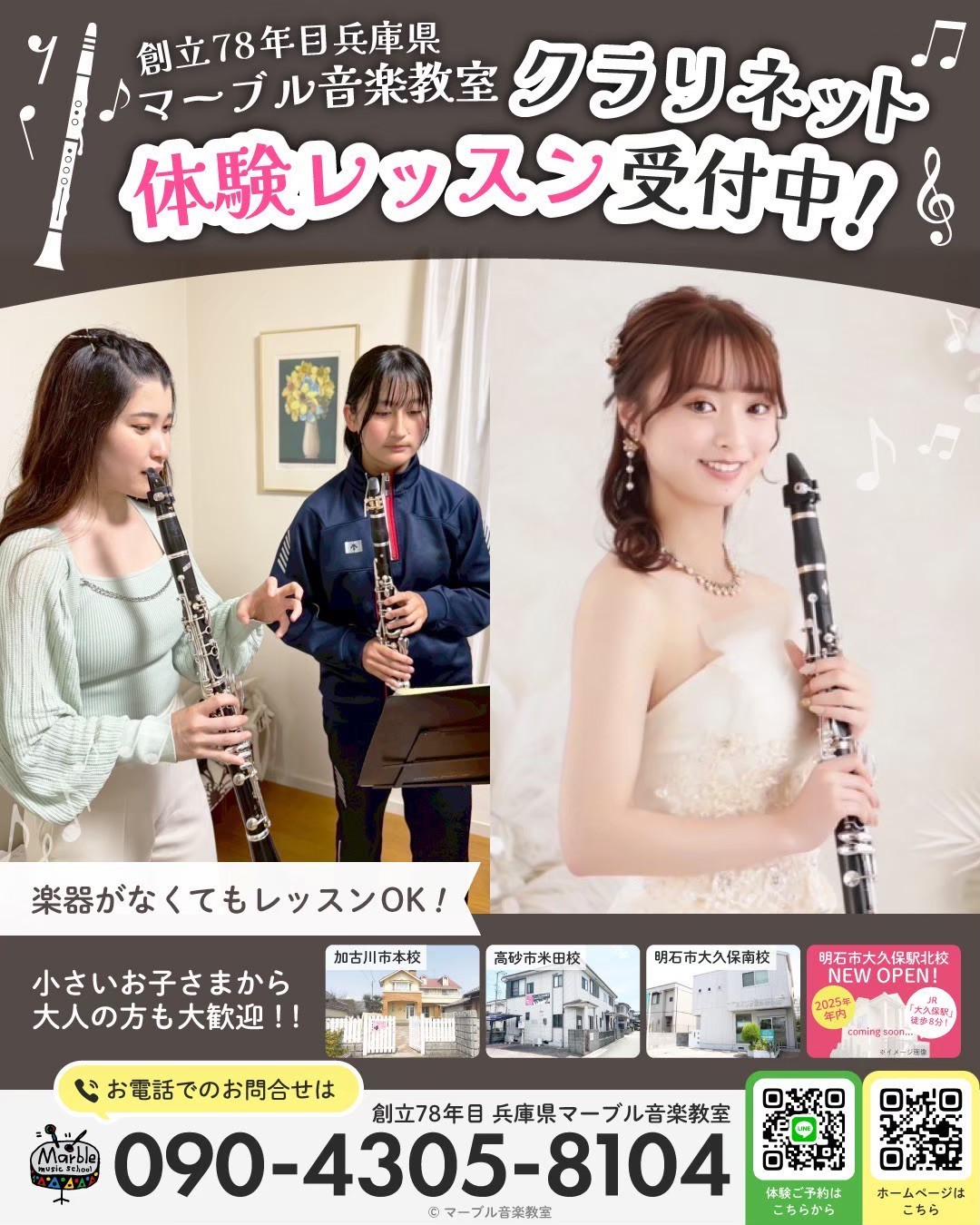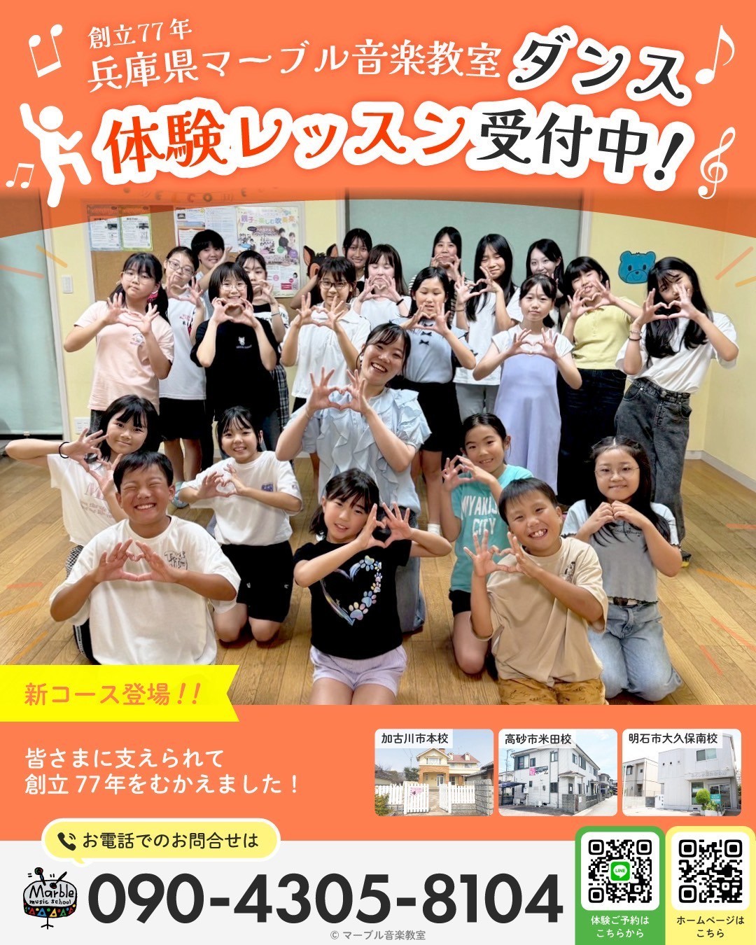 今年78年目を迎える兵庫県マーブル音楽教室は、加古川市に4会場と明石市大久保に2会場、高砂市米田と7教室を開校しております。