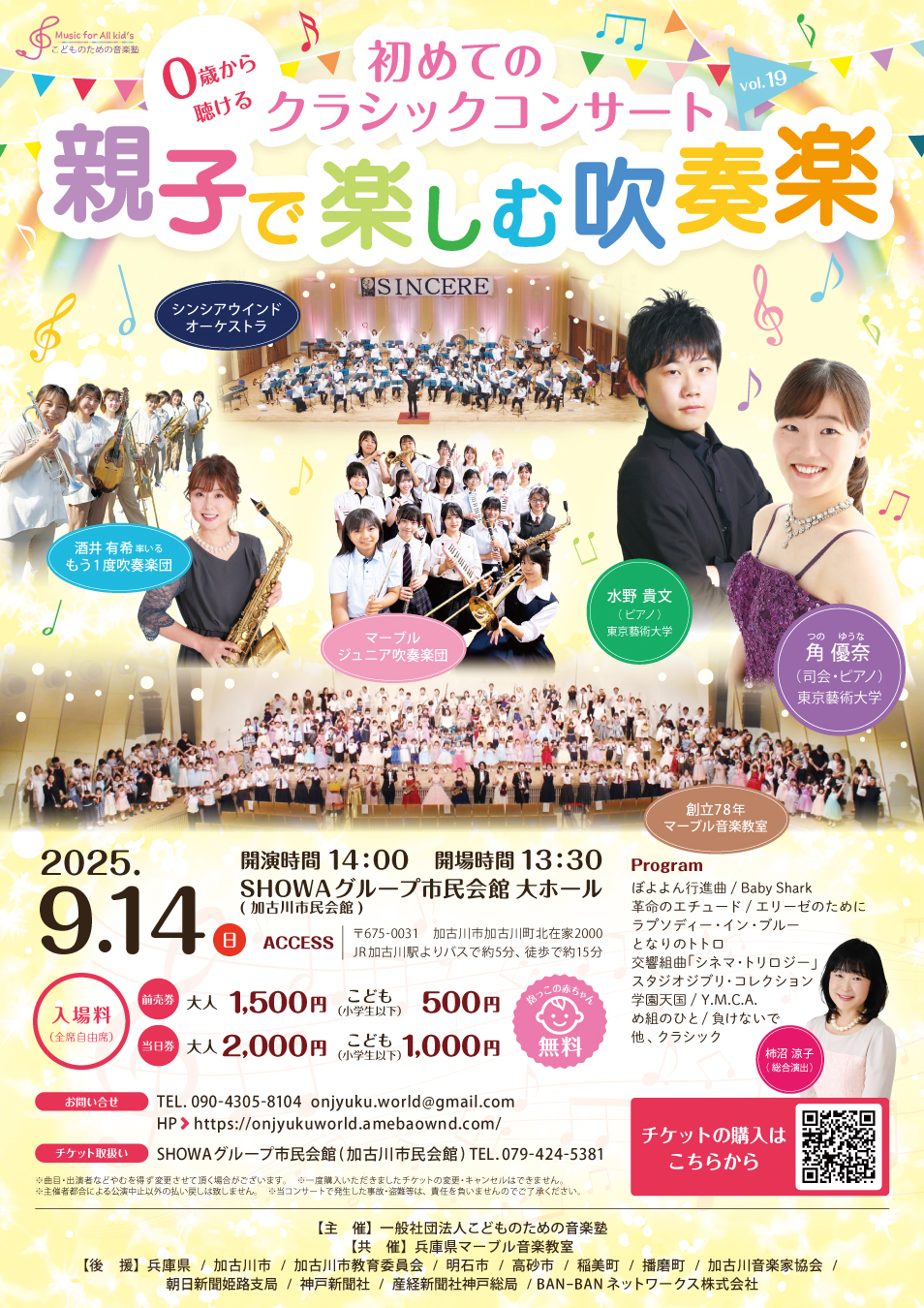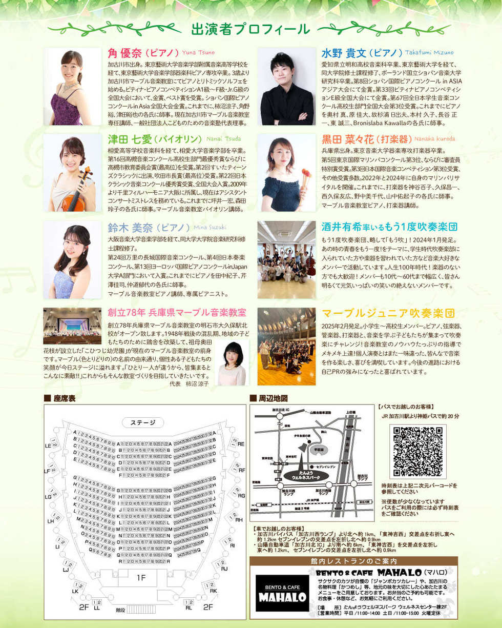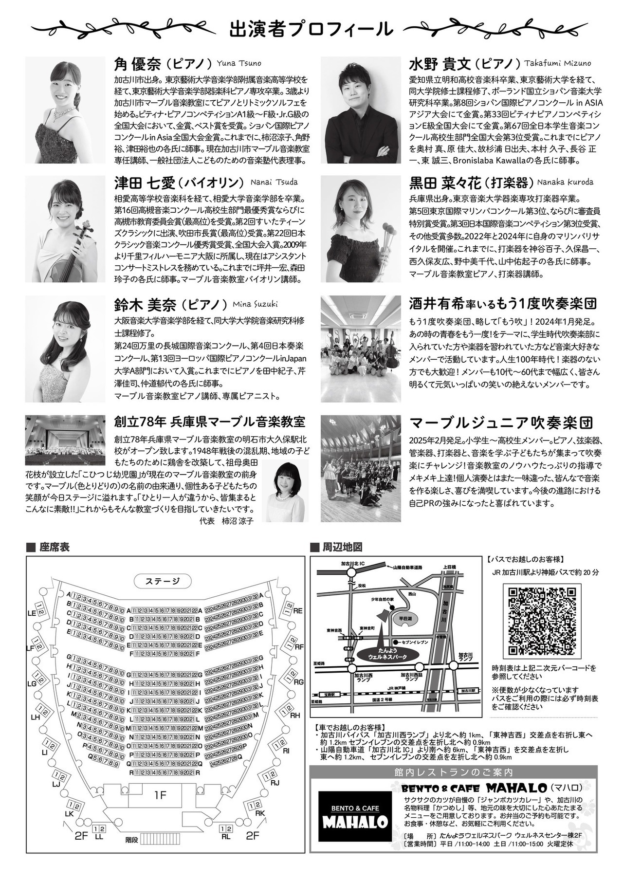 【出演】ピアニスト水野貴文&角(つの)優奈/バイオリン津田七愛/マリンバ黒田菜々花/ピアノ鈴木美奈/創立78年加古川市マーブル音楽教室/酒井有希率いる「もう一度吹奏楽団」&「マーブルジュニア吹奏楽団」