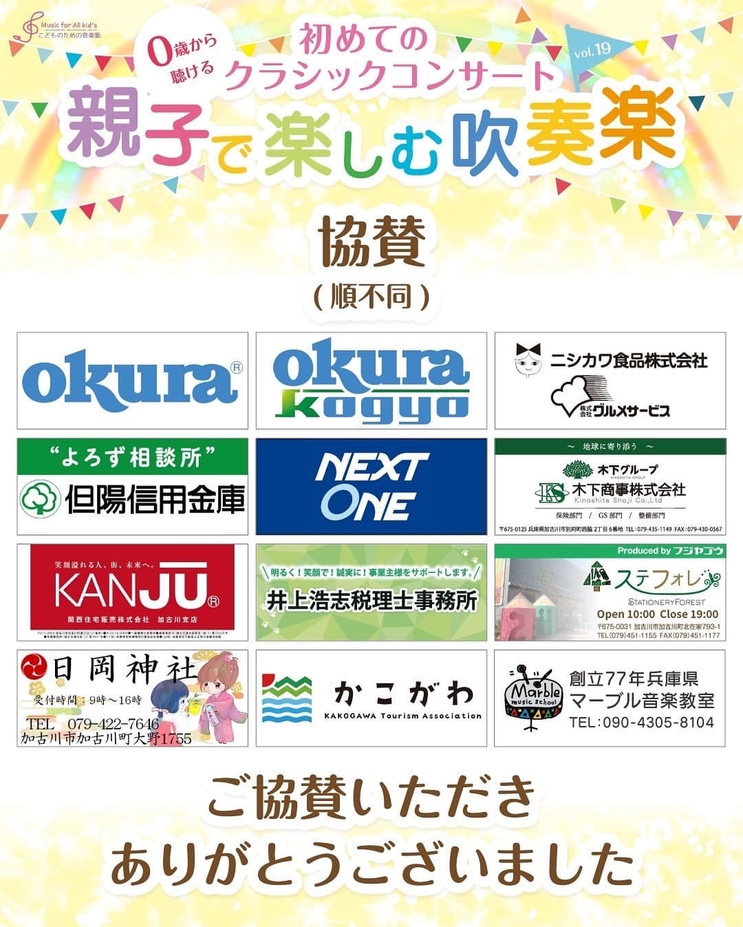 コンサートに協賛頂きました、オークラ輸送機様、オークラ工業様、ニシカワ食品株式会社様、木下商事株式会社様、但陽信用金庫様、フジヤ號様、日岡神社様、加古川観光協会様、ネクスト・ワン株式会社様、関西住宅販売株式会社様、井上税理士事務所様、錚々たる来賓の方々に会場に足を運んで頂きました。