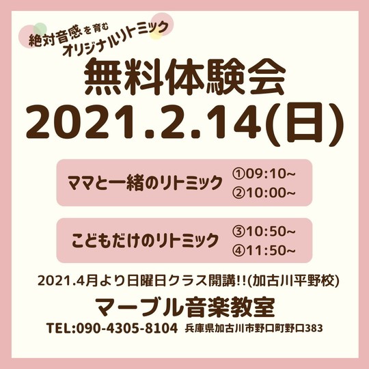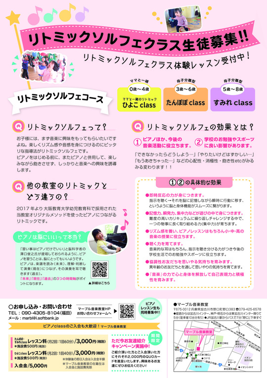 2021年4月より加古川市平野校(加古川グリーンシティマンション内)の開校に伴い、ママと一緒のリトミックソルフェ・こどもだけのリトミックソルフェ共に、日曜日クラスを開講致します!