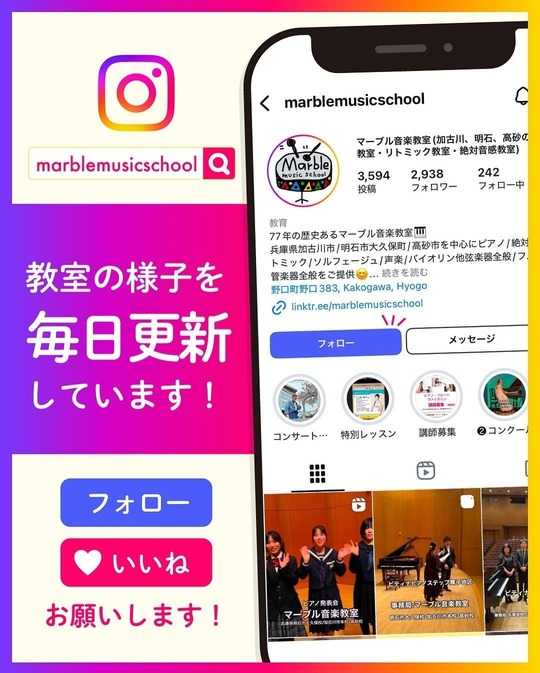 皆さまに支えられ今年78年目を迎えます、兵庫県加古川市に本校を、明石市大久保町、高砂市米田町に分校をもつマーブル音楽教室です。