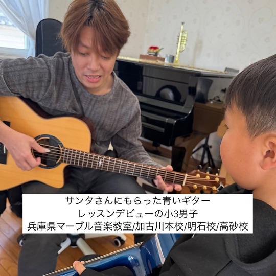 サンタさんから届いた青いギターを抱えて本日レッスンデビューの小3男子。かねちは先生の超わかりやすい手ほどきでみるみるうちに上達!その様子にママも感動!!