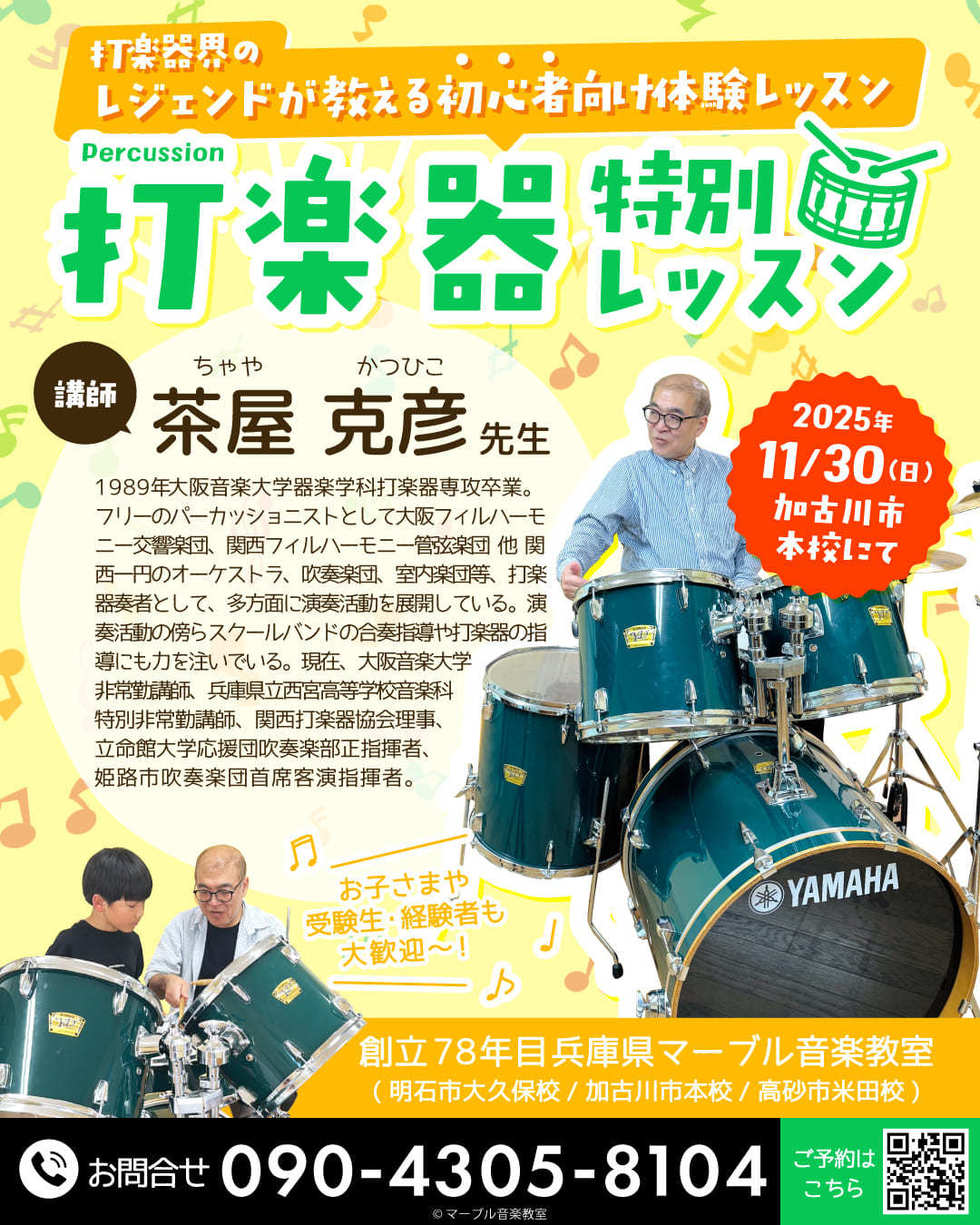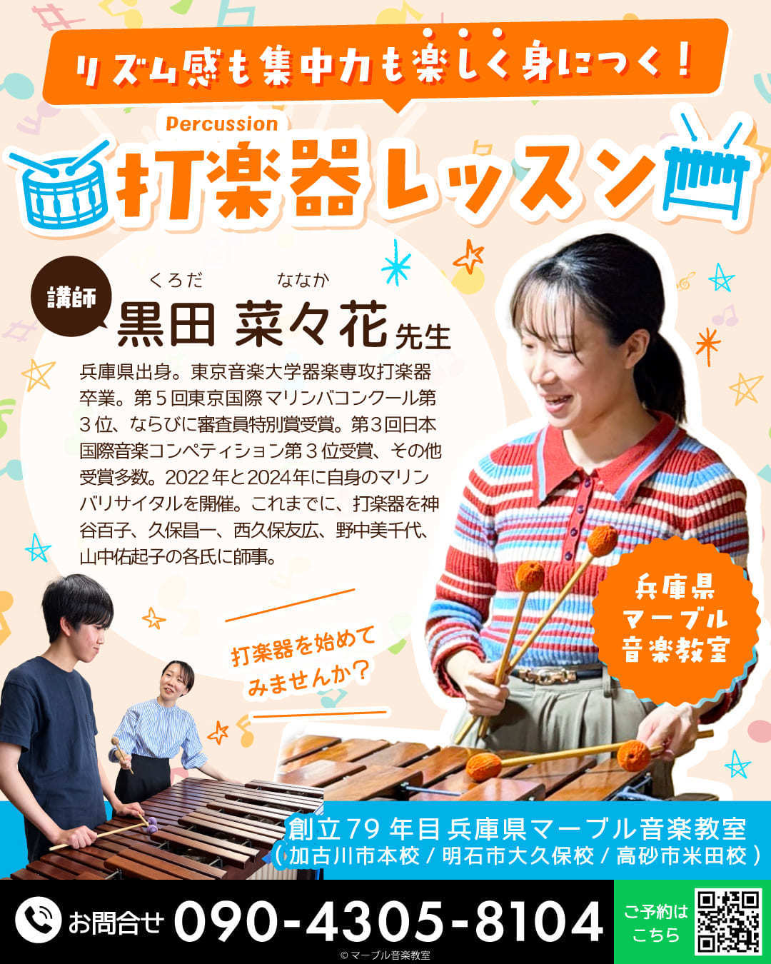 常勤講師の菜々花先生と萌花先生、そして打楽器会のレジェンド茶屋先生(大阪音大と兵庫県立西宮高校音楽科講師)の特別レッスン、それぞれ受講生募集中です!
