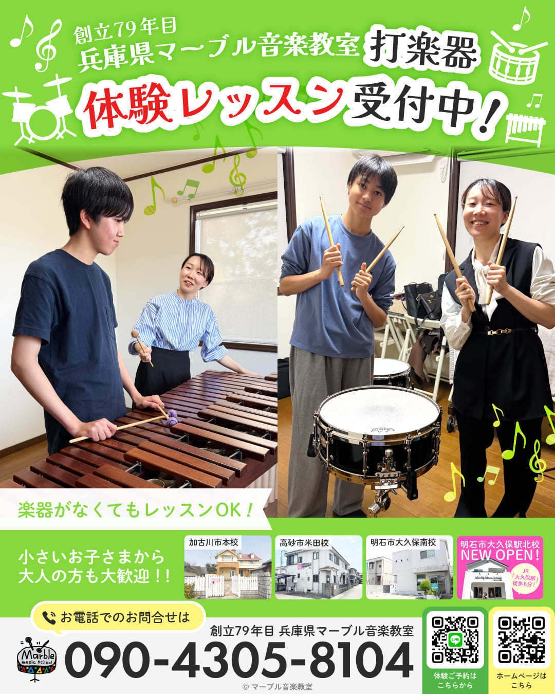 皆さまに支えられ今年78年目を迎えます、兵庫県加古川市に本校含む4会場を、明石市大久保町、高砂市米田町に分校をもつマーブル音楽教室です。