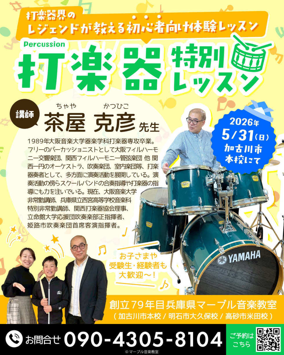 大阪音楽大学、兵庫県立西宮高校講師のレジェンド茶屋克彦先生の月に1回の打楽器特別レッスン生募集中!!