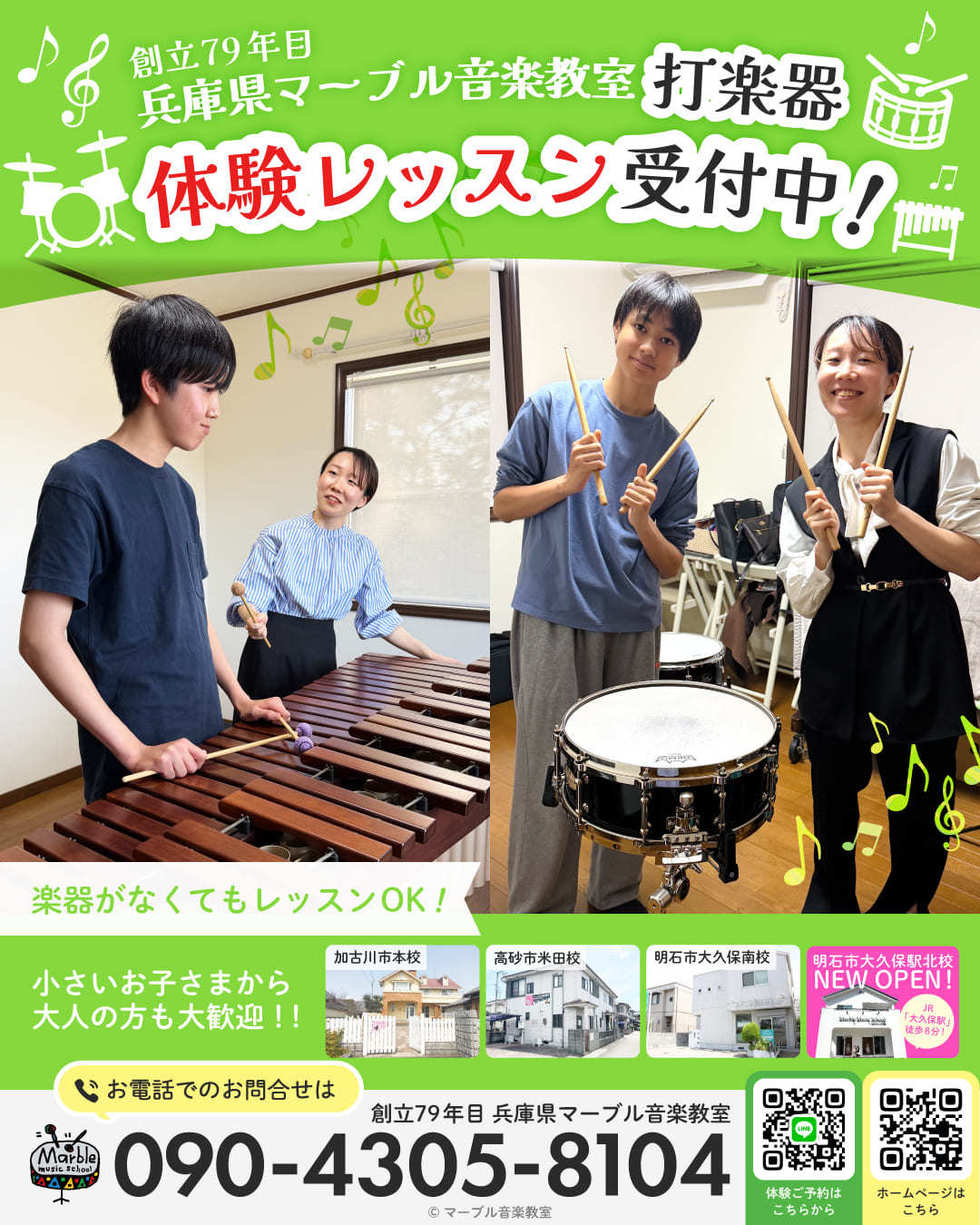 今年78年目を迎えるマーブル音楽教室は兵庫県加古川市に4会場と高砂市と明石市大久保に6教室開校しております。明石市大久保町駅南校に次いで駅北校が年内ニューオープン‼️