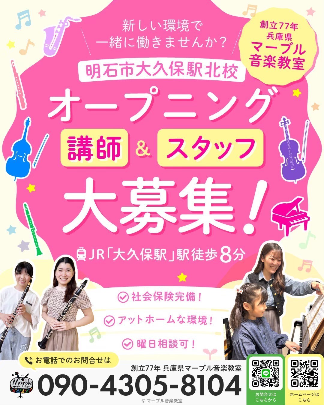 今年78年目を迎えるマーブル音楽教室は加古川市に4会場と高砂市と明石市大久保駅南校(大久保駅より徒歩5分駐車場10台完備)に6教室開校しております。大久保校には駅北校(JR大久保駅より徒歩8分駐車場9台完備)も2025年年内オープン致します‼️