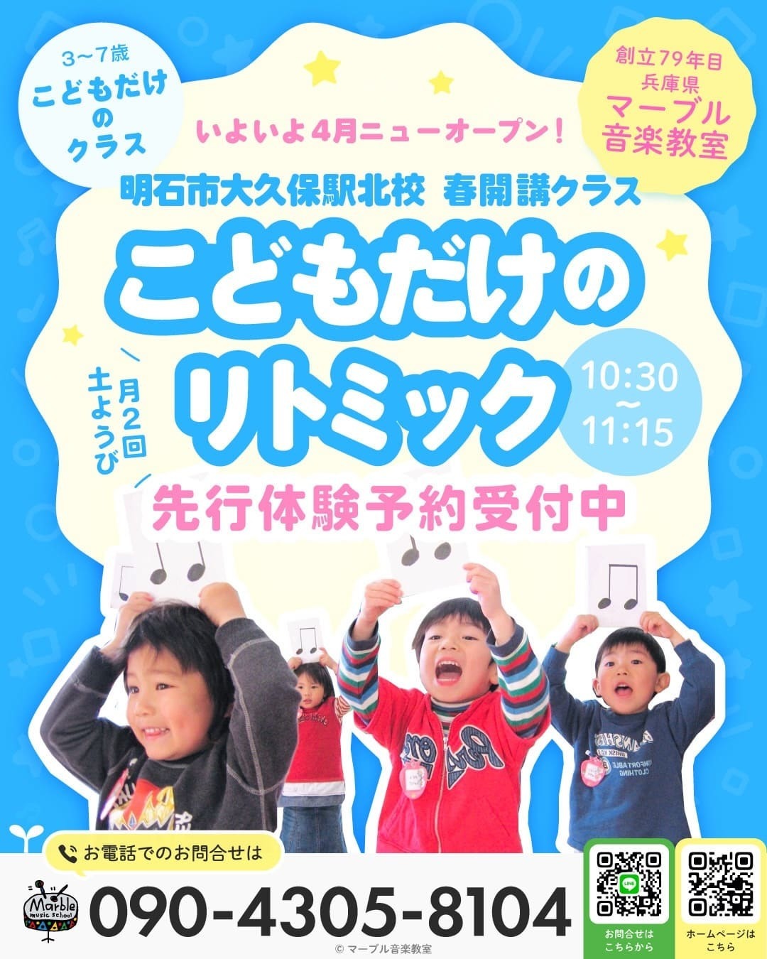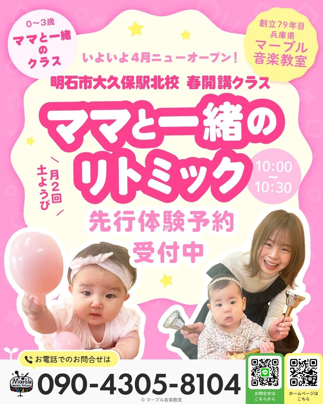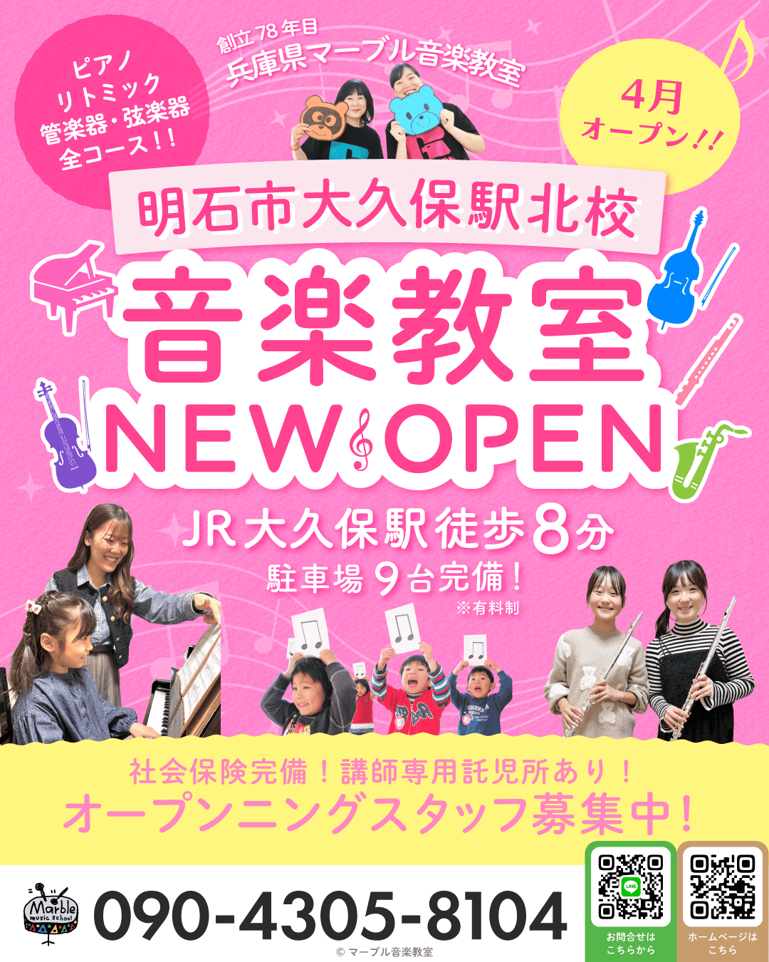 \兵庫県マーブル音楽教室、2026年4月1日、明石市大久保駅北校ニューオープンにつき音楽講師、オープニングスタッフ積極採用中‼️ /
