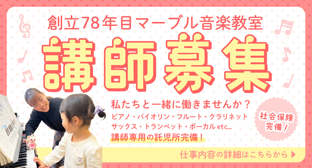 今、「ピアノの先生になりたい」の夢が叶って大好きなマーブル音楽教室で、たくさんの可愛いこども達や素敵な講師の先生方に囲まれ、音楽の楽しさを伝えていけることに心からの幸せを感じています。