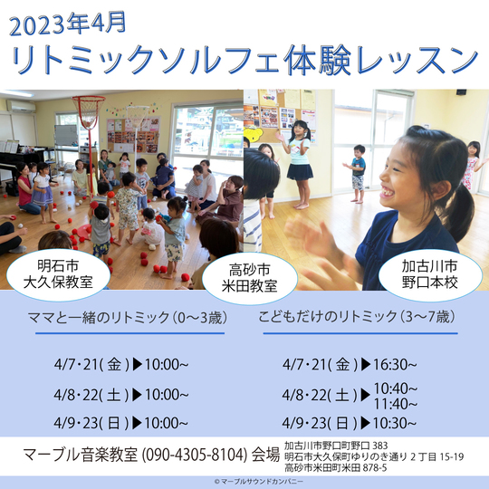 兵庫県加古川市、高砂市、明石市のマーブル音楽教室では、春のリトミック生を募集‼️