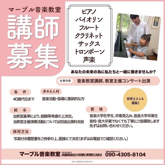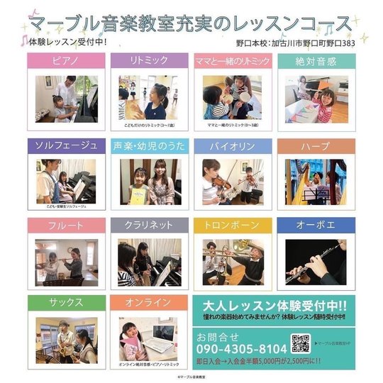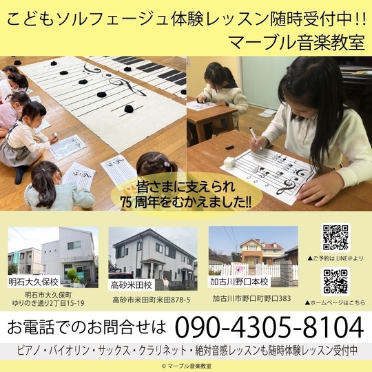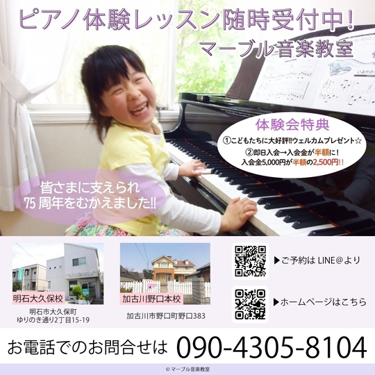75周年の歴史をもつ兵庫県加古川市のマーブル音楽教室は、高砂市米田町と明石市大久保町に教室を併設しています!