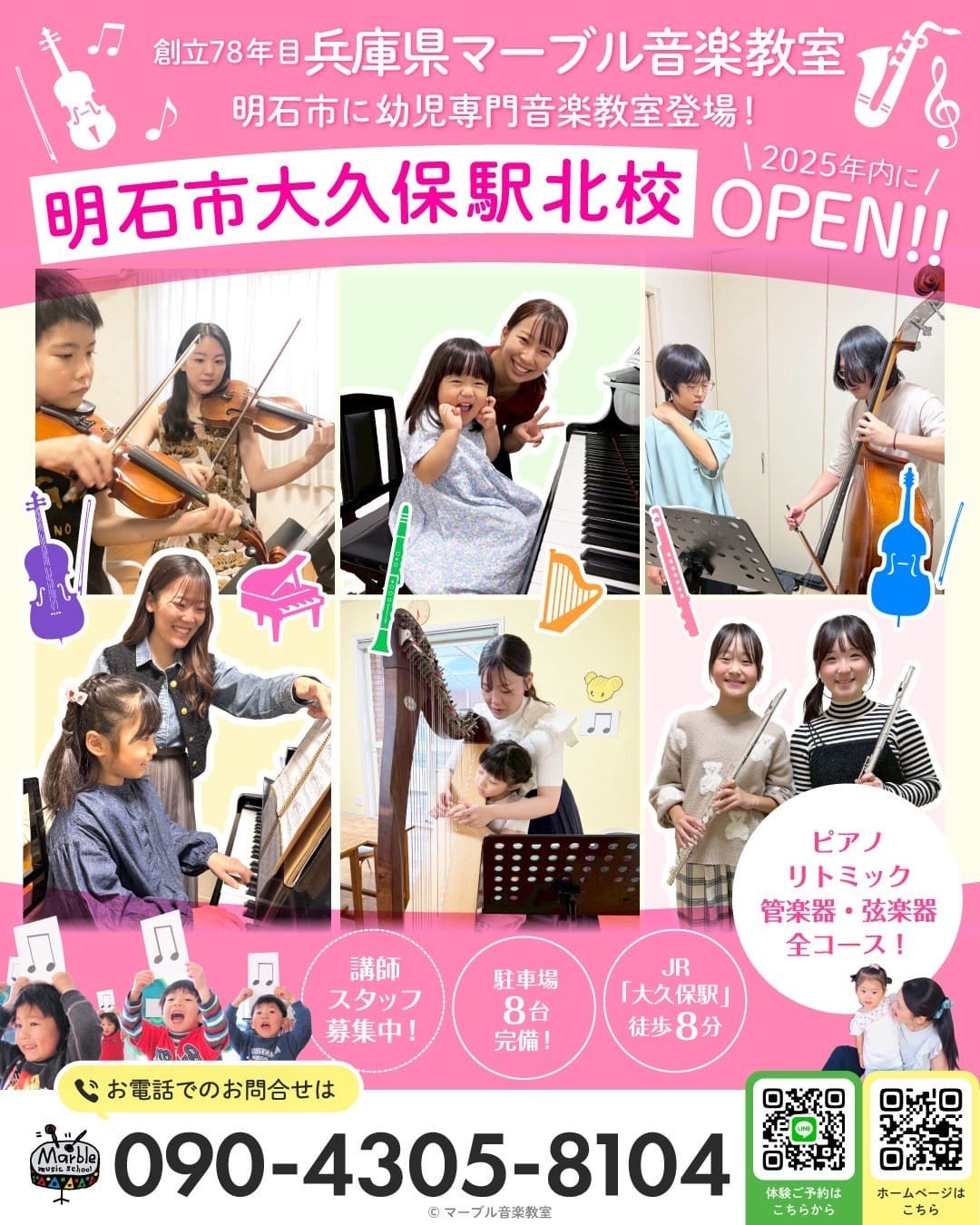 今年78年目を迎えるマーブル音楽教室は加古川市に4会場と高砂市と明石市大久保に6教室開校しております。