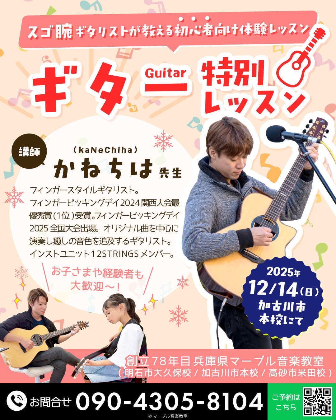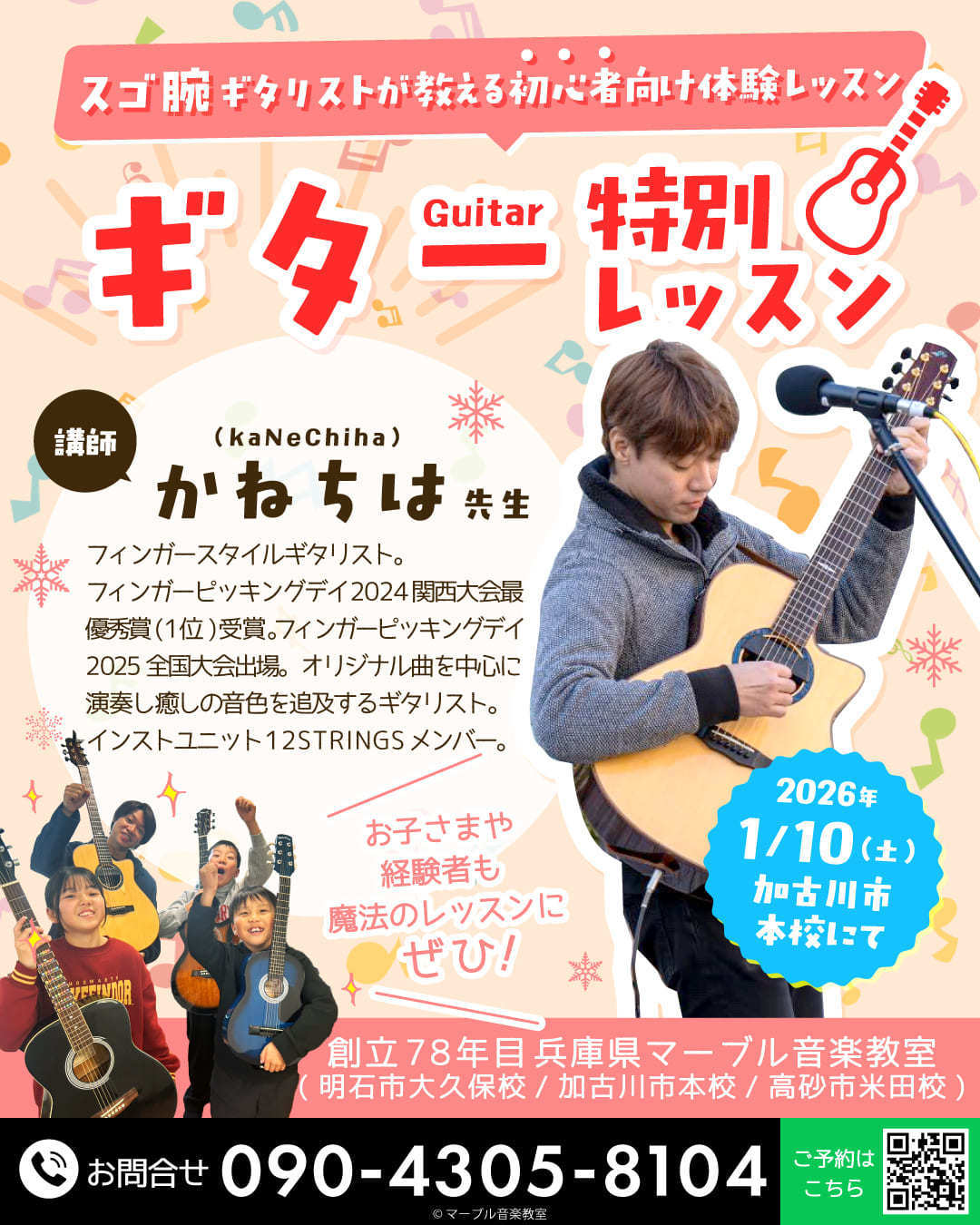 兵庫県加古川市マーブル音楽教室です!プロギターリストかねちは先生のギター体験レッスン生募集中です♪