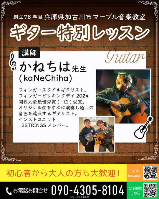 兵庫県加古川市マーブル音楽教室です!プロギターリストかねちは先生のギター体験レッスン生募集中です♪