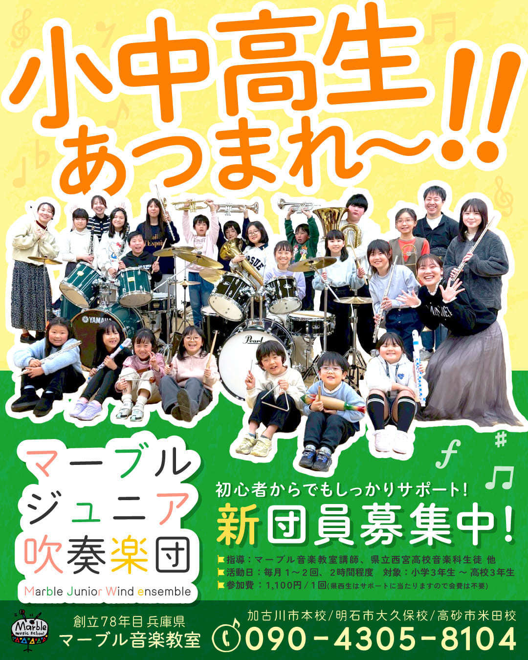 今年78年目を迎えるマーブル音楽教室は兵庫県加古川市に4会場と高砂市と明石市大久保に6教室開校しております。明石市大久保町駅南校に次いで駅北校2026.4月ニューオープン‼️