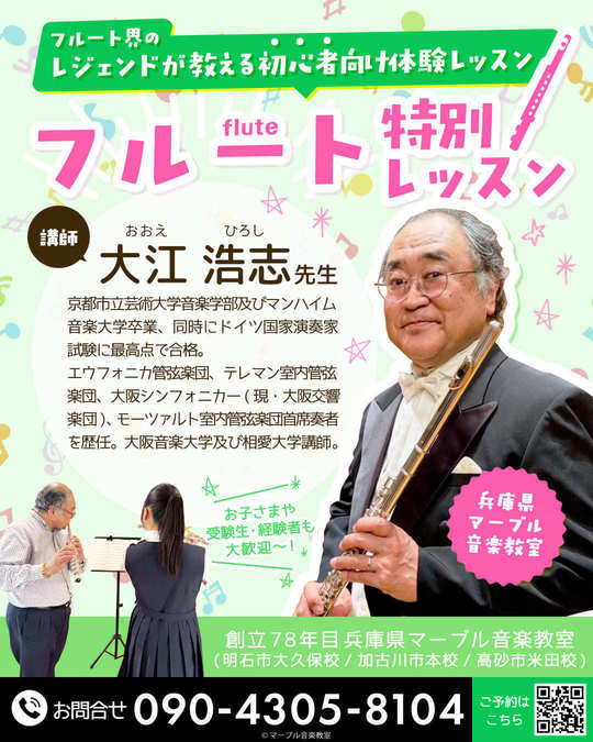 吹奏楽部でフルートを頑張る小中高生の皆さん、そしてオーケストラや吹奏楽団で活躍中の大人の方、大阪音楽大学講師、相愛音楽大学講師の大江浩志先生のフルート特別レッスン受講生募集です!!