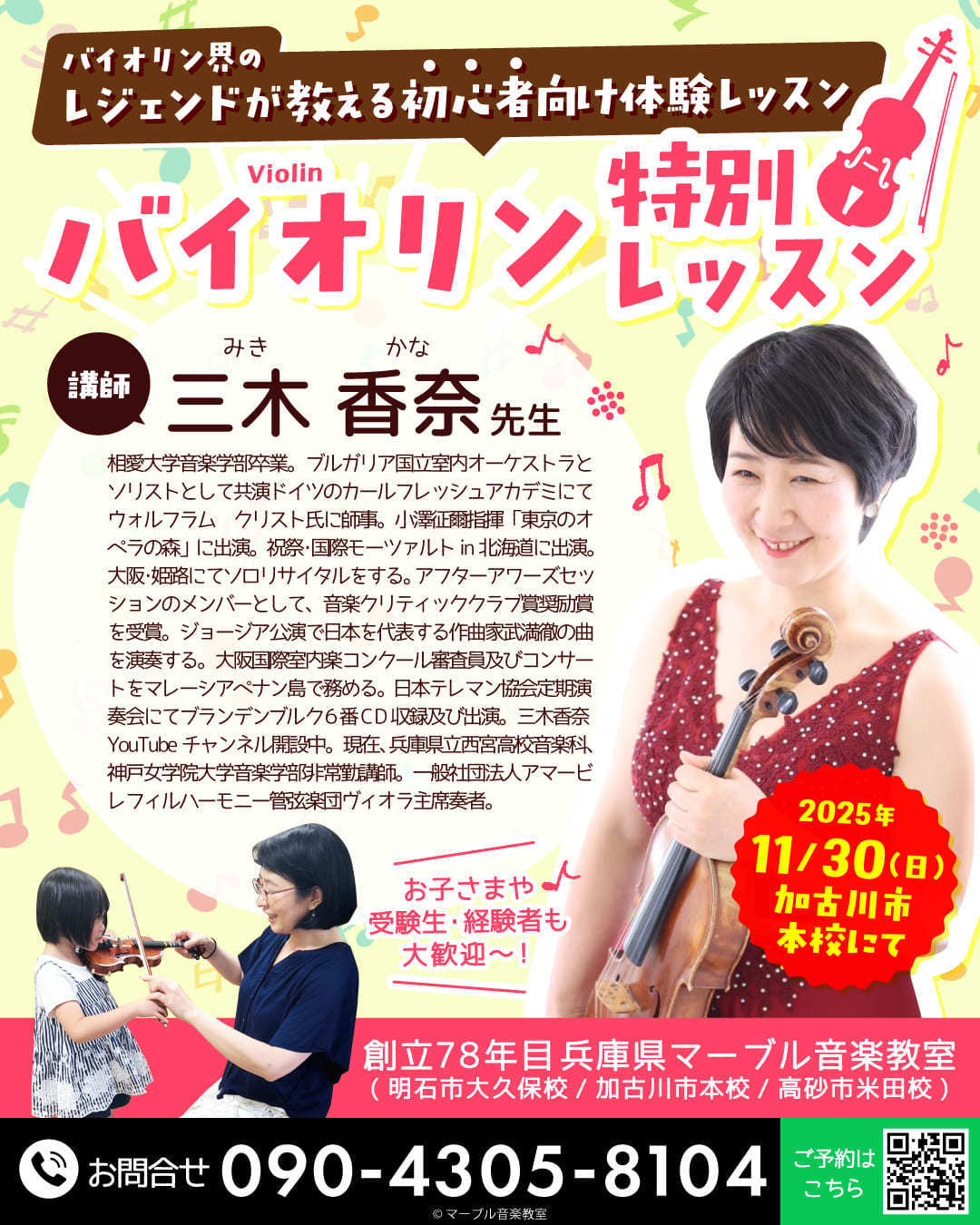 2025年10月26日(日)初心者や小さいお子さま大歓迎‼️神戸女学院音楽科講師、兵庫県立西宮高校講師の三木香奈先生の初心者向け特別レッスンのお知らせです♪