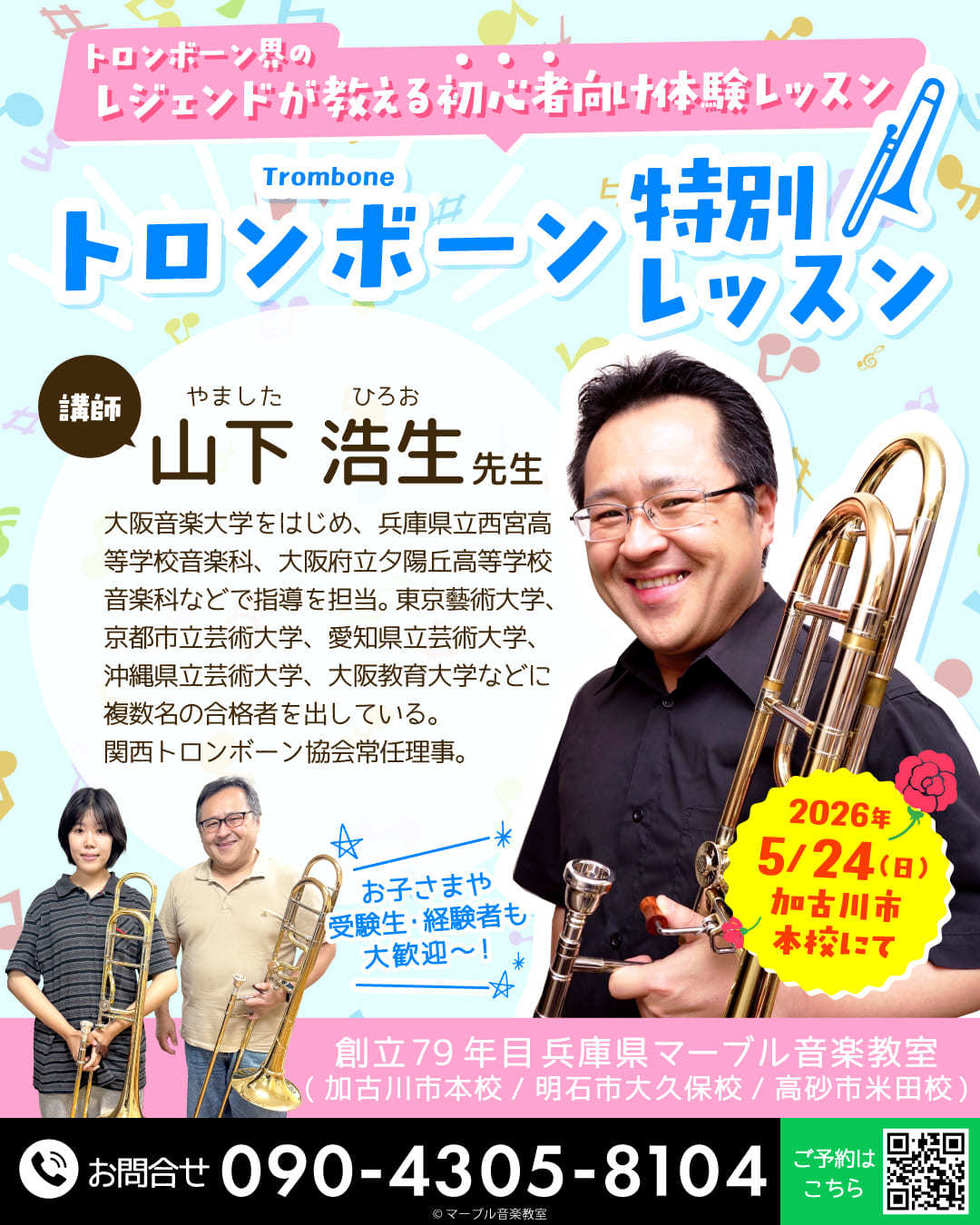 兵庫県マーブル音楽教室専属講師の達郎先生のトロンボーンレッスンでは小学生、吹奏楽部で頑張る中高生、そして大人の方までたくさん受講されています!吹奏楽部のお友だちと受講のできるグループレッスンも大好評!!