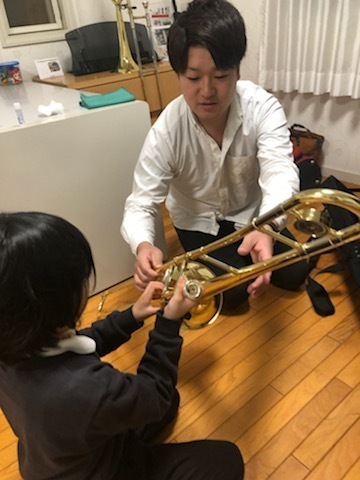 今日からスタートの小2のAちゃんと達郎先生のほのぼのトロンボーンレッスン風景です。
